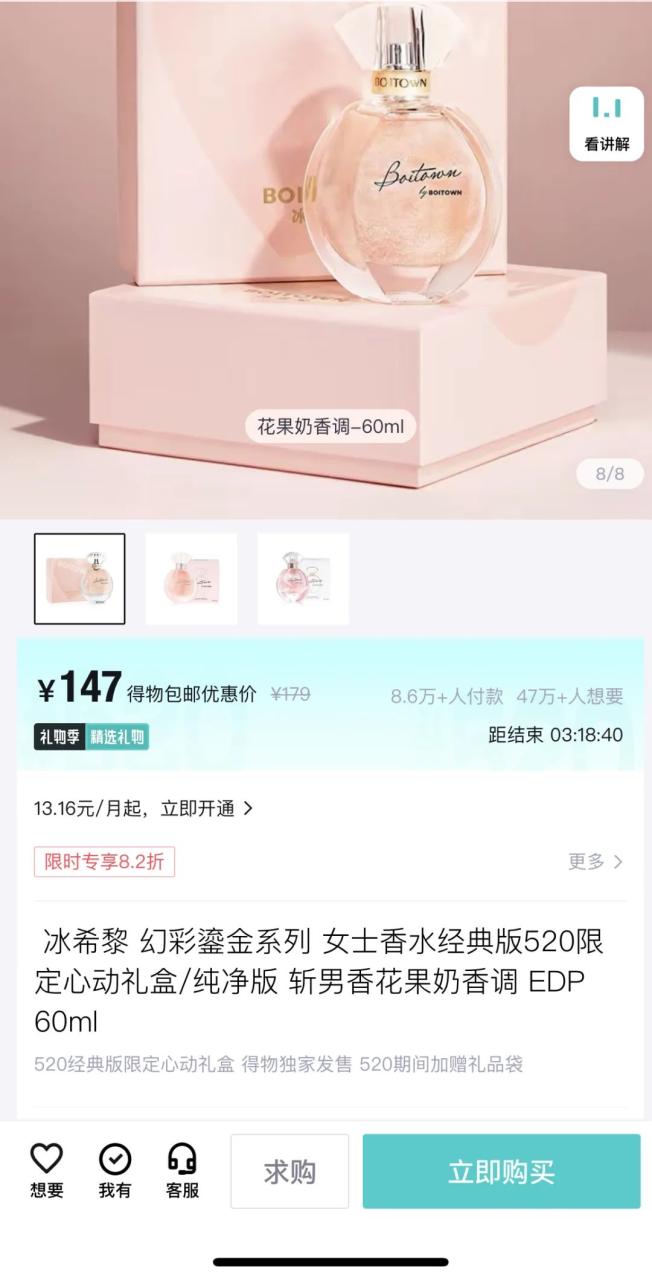 以国货新锐品牌冰希黎为例,它在“得物520礼物季”上新日通过推出全新独家幻彩心动礼盒、幻彩高定香意香水礼盒等获得了年轻消费者的喜爱。