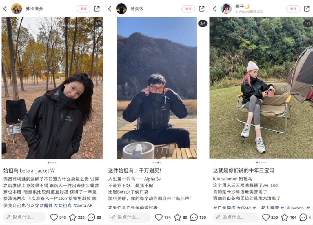 不难发现,社交媒体的聚光灯效应下,始祖鸟代表的户外运动逐渐演化为可以随性展示的视觉系,年轻人将对户外运动的“场景”格式化成日常穿搭中的一种风格。