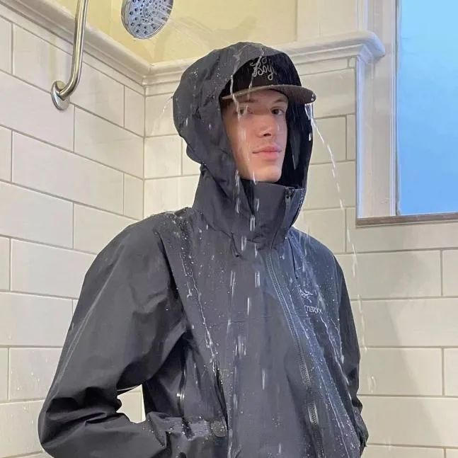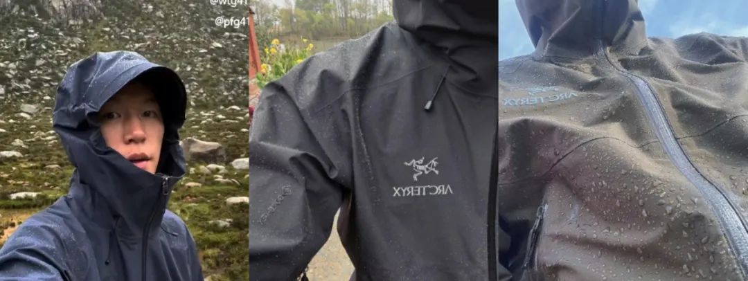 离谱到什么程度?有博主先是穿着始祖鸟站在淋浴喷头下,后又跳进游泳池里,结尾来上一句“just beads right off(只有水珠落下)”。