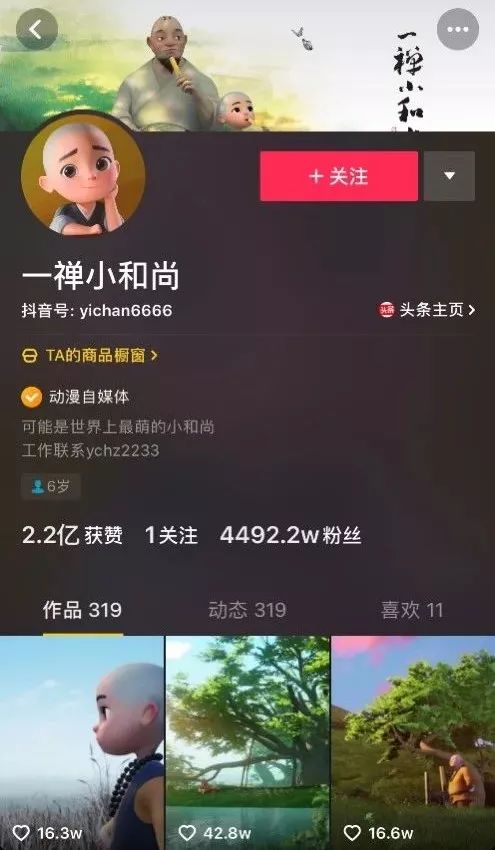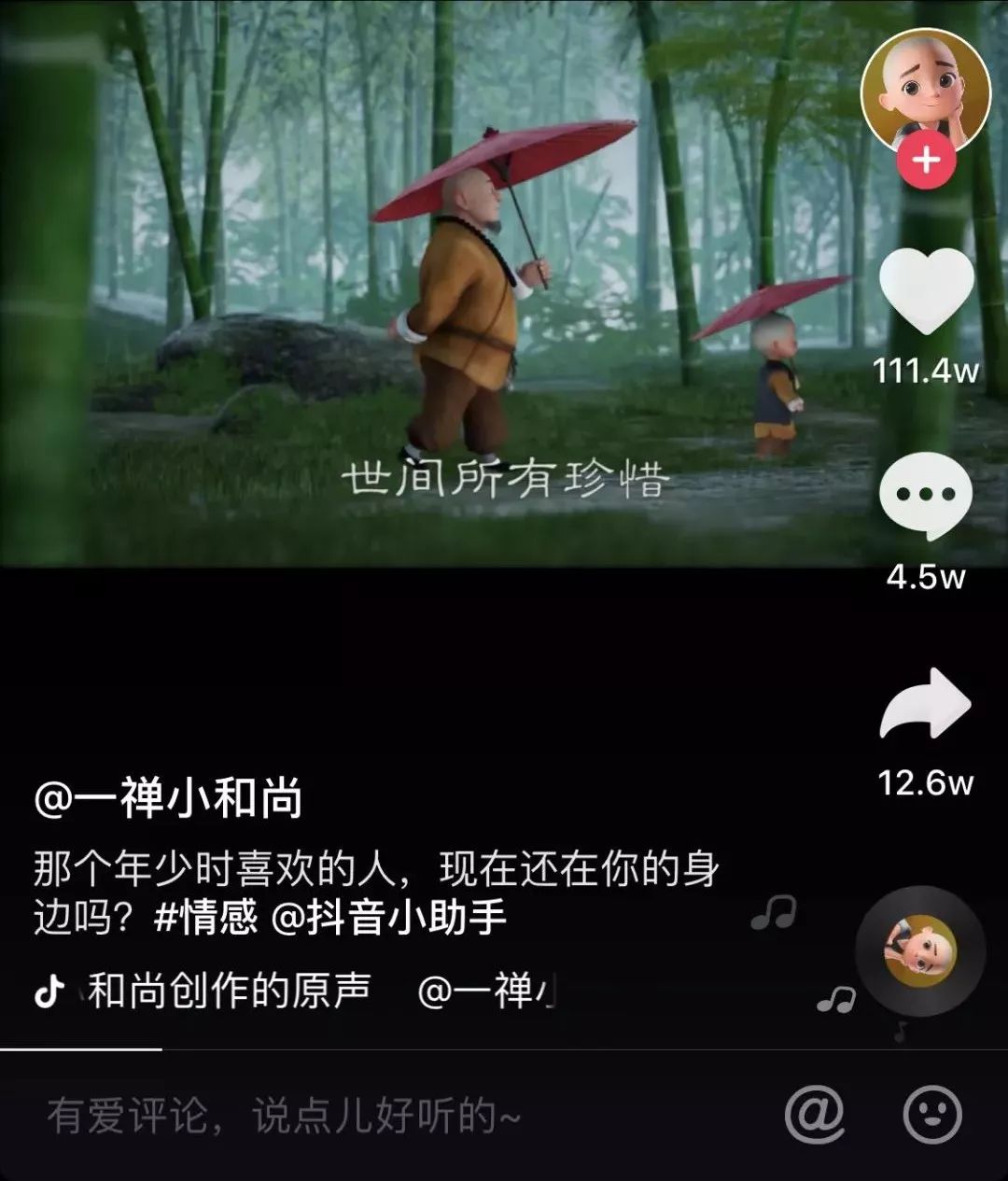 顶着一张天真无邪的脸,探索、解答着人世间困扰普罗大众的诸多疑问,小小年纪的一禅小和尚仿佛已经拥有了看破红尘后的释然。在这个流行“佛性”的时代里,凭借呆萌、温暖、治愈的形象,一禅小和尚收获了很多喜爱。最开始,一禅小和尚在微博上积累了不少粉丝,后续又在各大视频网站上线了动画短片,还有多部中国风漫画集。这些都为一禅小和尚奠定了坚实的粉丝基础,而在抖音平台上的视频发布,则进一步扩充了其粉丝的广度。