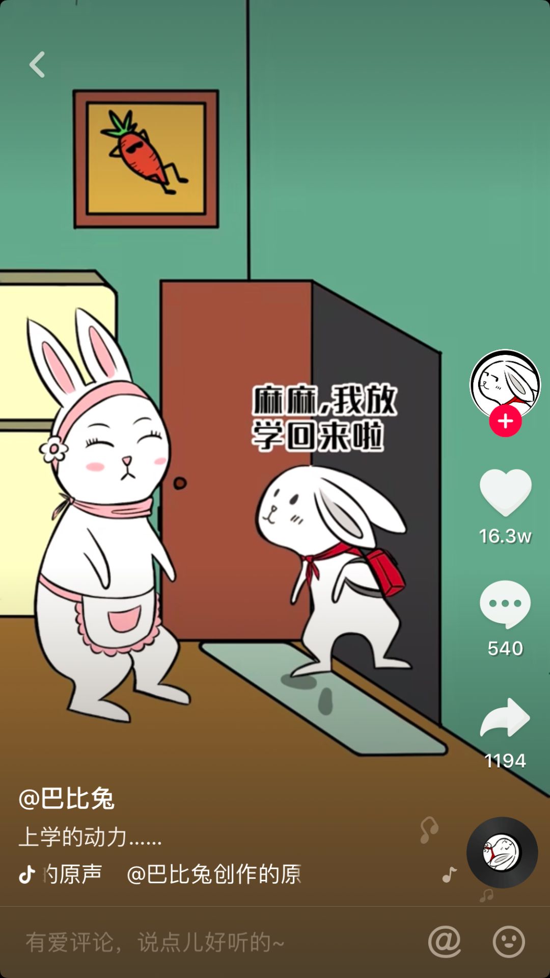 在巴比兔前期发布的视频中,出场人物只有巴比兔和他的父亲,表现方式基本是以一个画面中的对话为主。随着粉丝数量的增多,巴比兔在人物、画面、剧情上也逐步进行了优化:妈妈的出场充盈了人物关系,场景的增多和细化加强了用户的代入感,剧情的丰富深化了用户的共鸣。