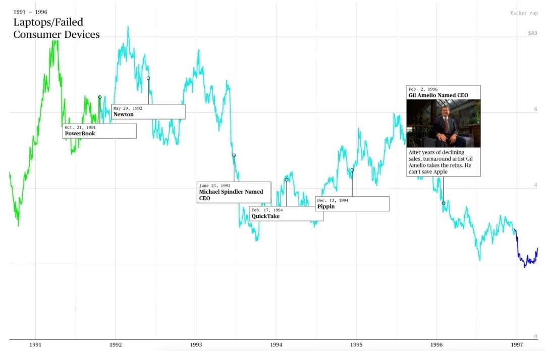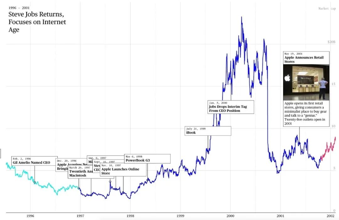 戏剧性的是,乔布斯回归后的一系列的操作逐渐让Apple起死回生,直至缔造后面万亿市值的传奇。