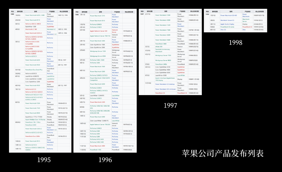 从Wikipedia上我找到了一系列产品发布,你会发现97年是个分水岭,之前的列表都是一大堆产品...而之后则简洁美丽。