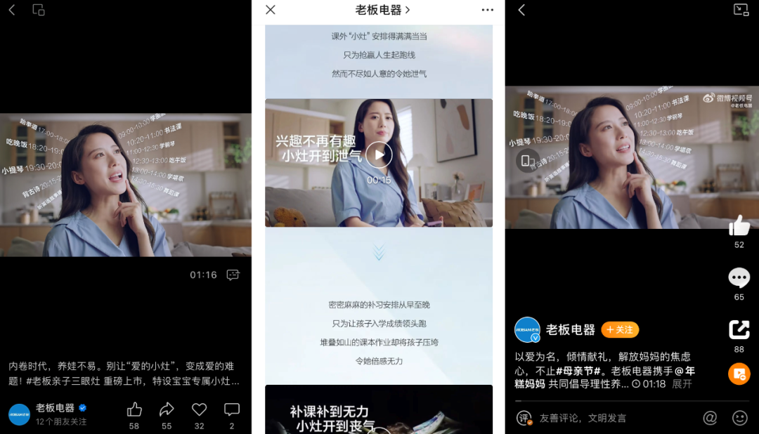 此次,老板电器就打通了品牌站内资源,系列短片不仅在官方微信视频号上发布,还在官方公众号、官方微博等平台同步上线,充分触达精准用户群体,第一时间让创意广告内容在其私域流量池发酵。