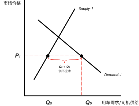 所以现在回头来看出行市场的问题,当早高峰来临时,人们都赶在这个时间段上班、外出,晚高峰大家集中下班、回家,用车需求徒增,而受交通情况、司机数量的限制,此时城市的运力供应并不能满足所有用户用车需求,而出现供不应求,如下图所示。