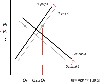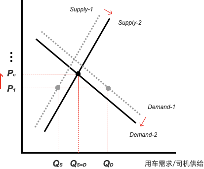 根据供需定理,价格是影响需求和供给的核心因素。如果这个时候通过价格调控,让价格适当上浮,那么部分对价格相对敏感的用户,就会选择放弃,而换乘其他交通工具,而因为价格上涨司机收益增加,将会有更多司机愿意提供服务,如下图所示。