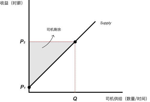 图丨司机(生产者)剩余,如果司机成本为P1,而实际价格为P2,司机获得利益为Q×(P2-P1),正好为三角形面积