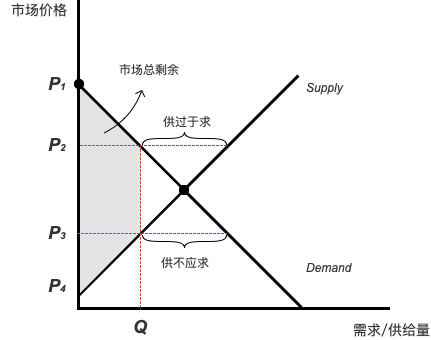 图丨市场供不应求和共过于求状态下,市场总剩余