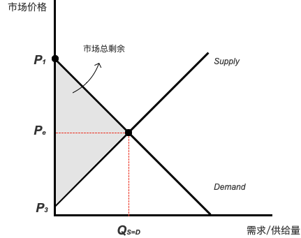 图丨市场供需均衡状态下,市场总剩余,相比于供求不相等的状态,该种状态下,市场剩余面积最大