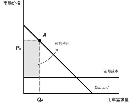 固定价格下,提供相同的服务,边际成本是不变的。那么司机获得的利润,就等于乘客支付的价格,减去边际成本。图中正方形面积区域即为司机获得的整体收益。