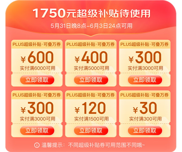 会员大额优惠券,是近几年平台针对会员专门推出的优惠,比如京东PLUS会员的满6000减600、满5000减400、满3000减300等,天猫88VIP的满5000减400元和满1500减120元券,这些优惠的特点一是会员专享,二是额度远大于全平台的普惠优惠。