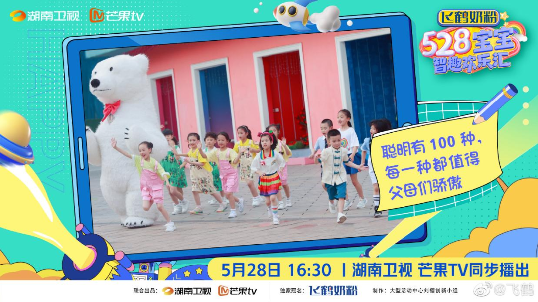 为了进一步解锁节日“仪式感”,跳出传统造节玩法中对销量的过度关注的思维桎梏。飞鹤也与湖南卫视、芒果TV共创了热门综艺《528宝宝智趣欢乐汇》,以新颖的节目立意、强大的嘉宾阵容和高能有趣的内容营造了满满的节日仪式感,为大朋友和小朋友们打造了一场参与性强、能共情、体验感极强的线下狂欢。在提升活动感知度的同时,也扭转了大众对于品牌造节=自说自话的刻板联想。
