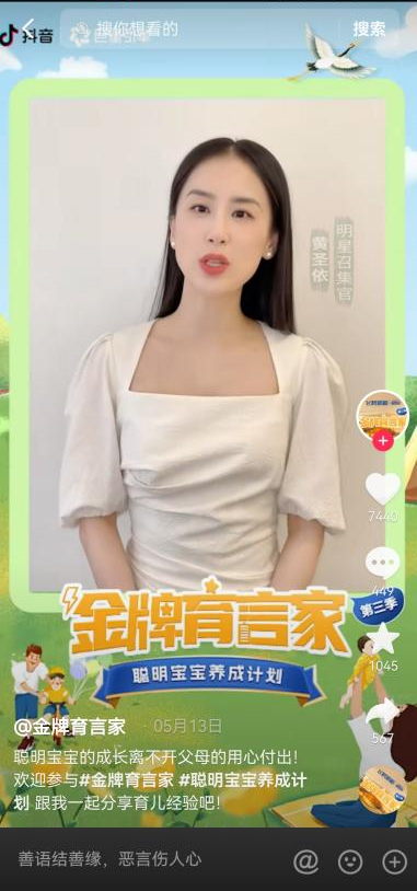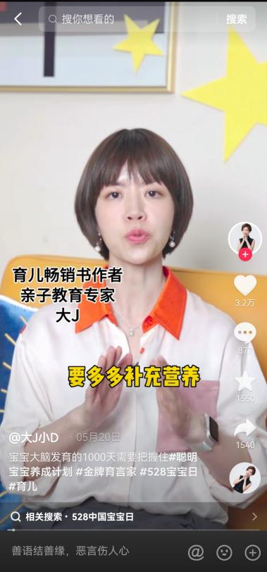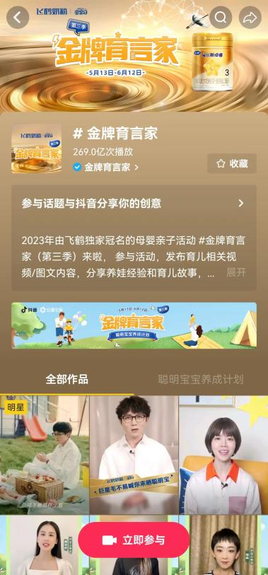 虽说以科普形式传递品牌信息,能让产品优势更具说服力,但枯燥单一的讲解和呈现往往难以激发受众兴趣,一些艰深晦涩的理论和知识更使人望而却步。所以飞鹤另辟蹊径,将专业知识转化为大众能接受的语言。比方说在抖音积累了269.0亿次播放的#金牌育言家,就以养娃经验和育儿知识为载体,在大家熟悉的社交语境中传递“生命早期1000天大脑发育黄金期”的重要性。