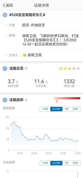 数据显示,这场《528宝宝智趣欢乐汇》不仅拿下了湖南卫视&芒果TV的收视第一和综艺影响榜第一,也带动了平台上相关话题的热度,节目话题#528宝宝智趣欢乐汇#就在短短时间累积了3.7亿的阅读量和11.6万的讨论量。随着节目在百花齐放的儿童节传播中顺利“突围”,节目背后的528宝宝日和品牌所倡导的育儿理念,也在关键节点和互动热情中迅速引爆。