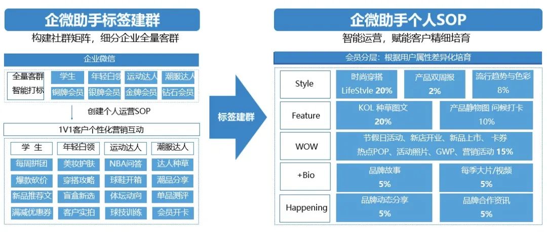 以微盟企微助手曾服务过的一家全国性饰品品牌为例,利用微盟企微助手的多维度标签体系以及标签化建群能力,该企业对于全量品牌客群都进行了相关的标签设置,并进行了同类标签的建群,根据不同的会员属性进行了不同比重的内容设置,从价值给予和品牌认同两个角度设计多维度的营销内容。