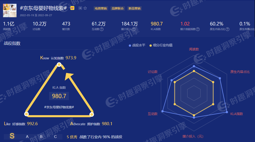 同时,618京东母婴话题的KLA战役指数达到了980.7,营销内容的互动数也远超行业均值。