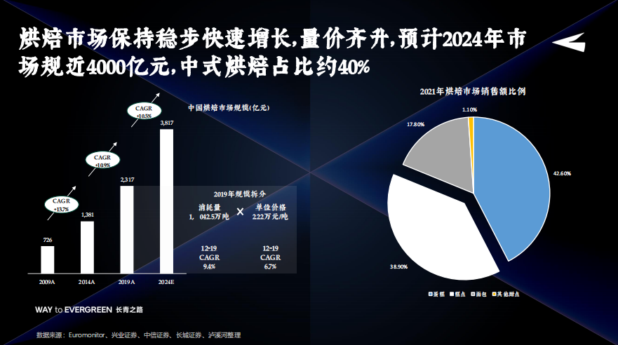 从大盘数据上看,其实整个烘焙行业的想象空间很大。根据2019年的统计数据,这个行业有2300多亿市值,而且这几年一直都保持着10%的增长。预计到2024年,烘焙行业的市场容量能达到4000亿元。