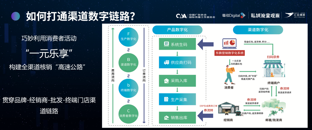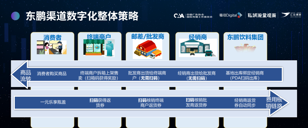 通过券的流转,就实现了整体的闭环,构建整个全渠道的核销的高速链路,贯穿东鹏特饮从品牌到经销、批发,到终端门店,再到消费者的链路,这样就实现了真正的F2B2b2C。