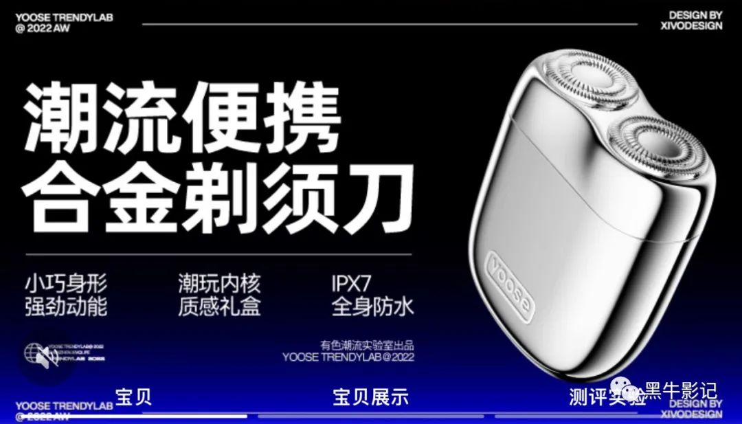 “男人的第二把剃须刀”则是很好的信息位,卖点主打和耳机盒一样大小,Type-c手机通用充电口,放在车上办公室里都是方便应急的小帮手。