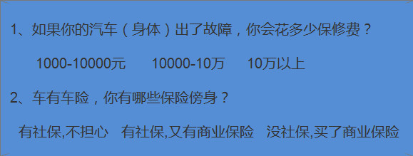 以下问题不是直接问你有没有买过保险,你愿意花多少钱来买保险,而是委婉地把身体和汽车做类比。