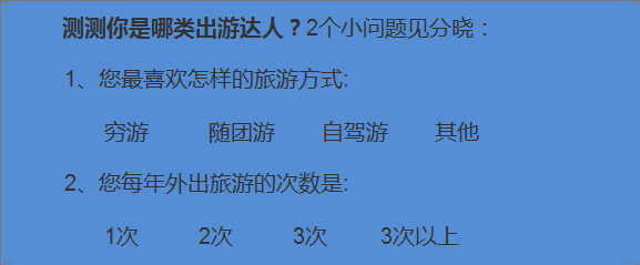 再比如在旅游季用轻松的测试形式,左图2个小问题问的是旅游方式,可以间接得出用户的经济水平/有车/外出频繁等信息。
