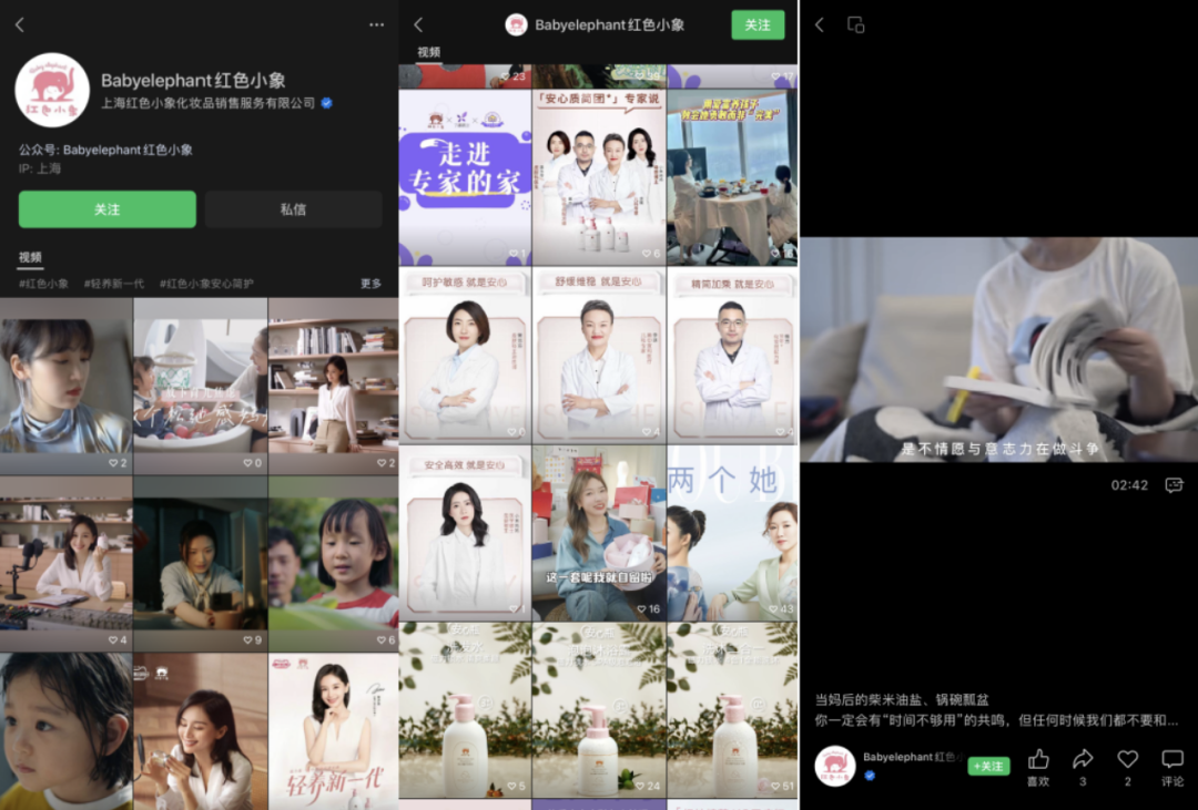 账号名字为「Babyelephant红色小象」,和公众号相关联。视频内容以产品种草、专家科普、检测报告、励志故事为主。