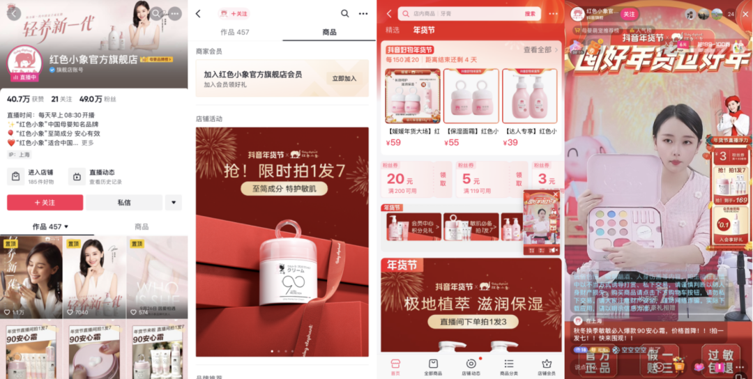 红色小象在抖音拥有49万粉丝,账号每天固定8:30-23:30开启直播,内容主要以带货、种草为主。