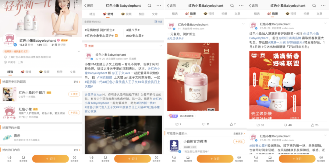 红色小象在微博有15.6万粉丝,视频累计播放量为50.8万,微博主要内容以节日祝福、产品种草、有奖互动等为主。