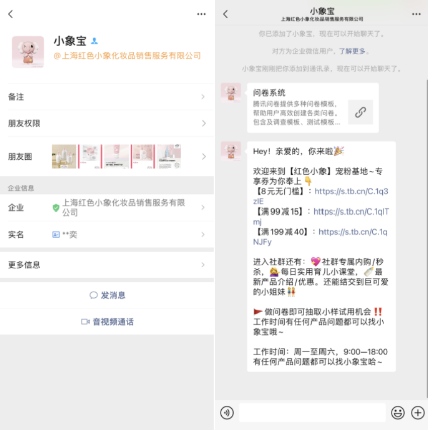 添加企微后,自动弹出问卷调查,发送无门槛优惠券领取链接,并介绍社群价值引导添加社群。