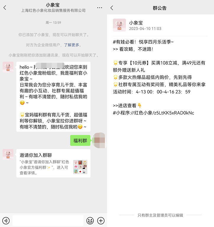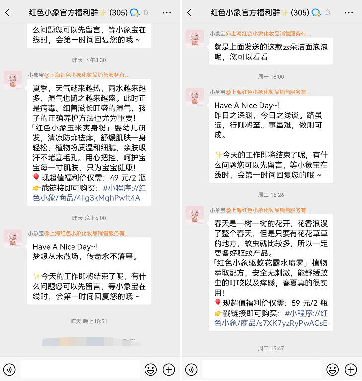 红色小象的福利群互动较少,主要是福利官发布活动、产品种草以及维护秩序,发布频率也不高,一天1-2次,下面以一天内容举例: