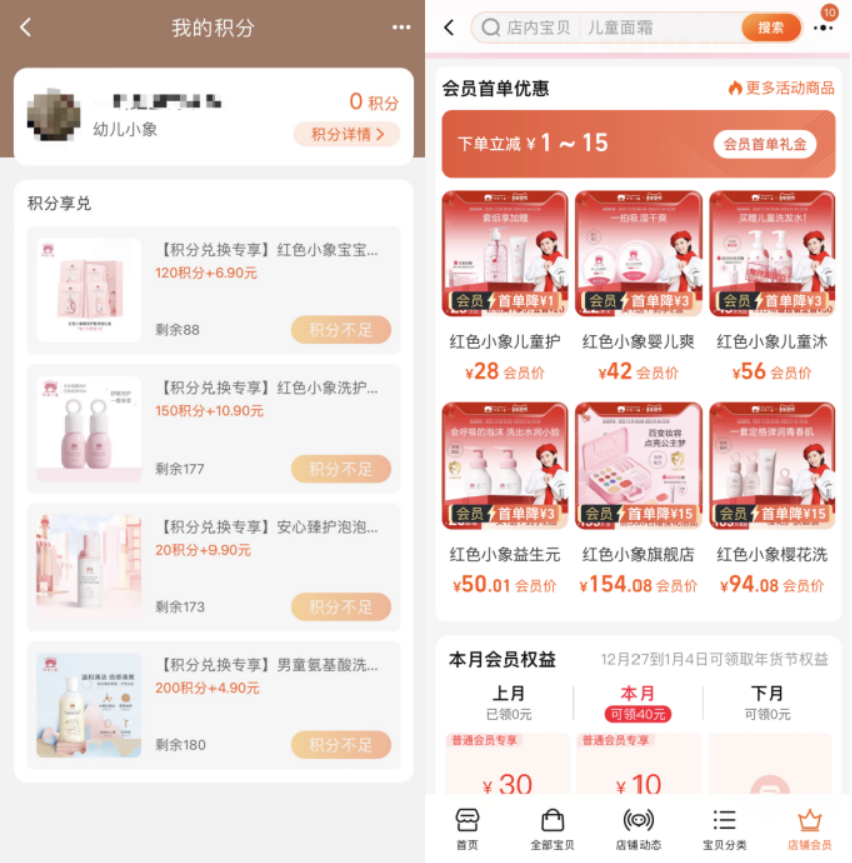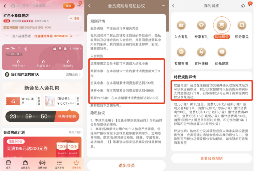 红色小象电商平台的会员体系比较完善,主要以成长会员+积分体系为主。下面以天猫平台的会员体系为例。