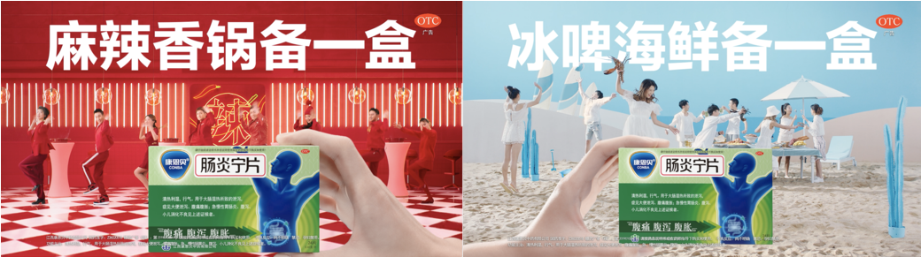 康恩贝肠炎宁在导入领航定位咨询之前的策略,总是在占据认知优势和拓宽应用场景之间反复。并且场景也不聚焦:一次性推出 “麻辣香锅备一盒” “冰啤海鲜备一盒” “出国旅行备两盒” 三个场景。