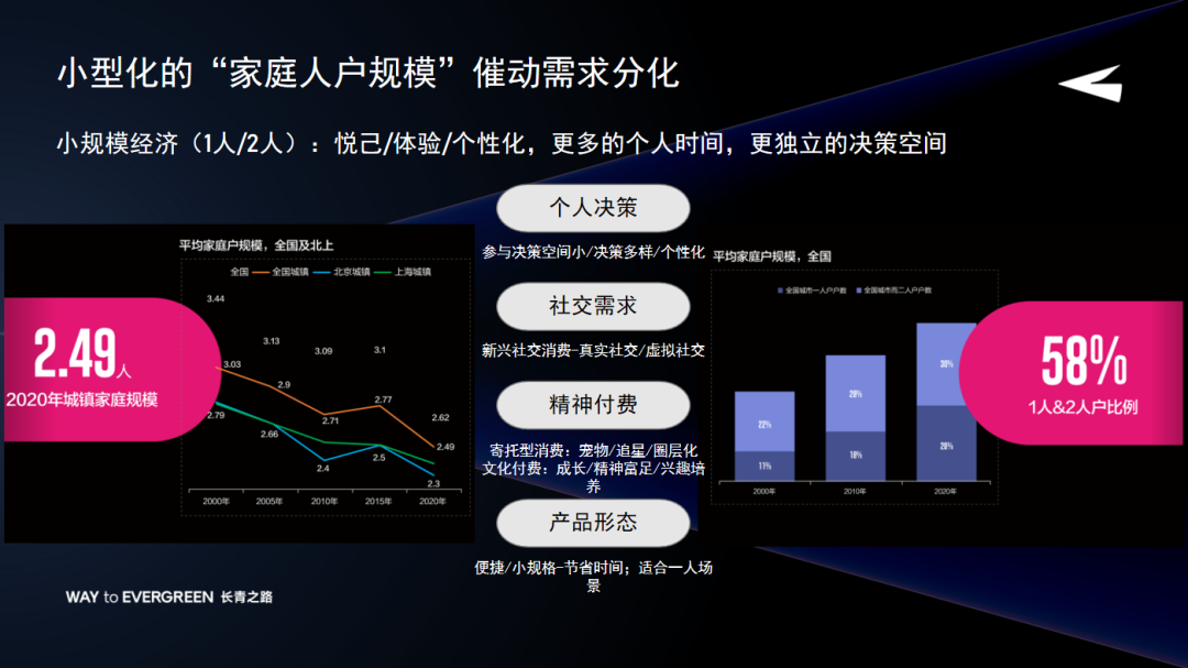 第二,2020年中国城镇家庭的平均规模是2.49人,1-2人的小户家庭占比超过了58%。