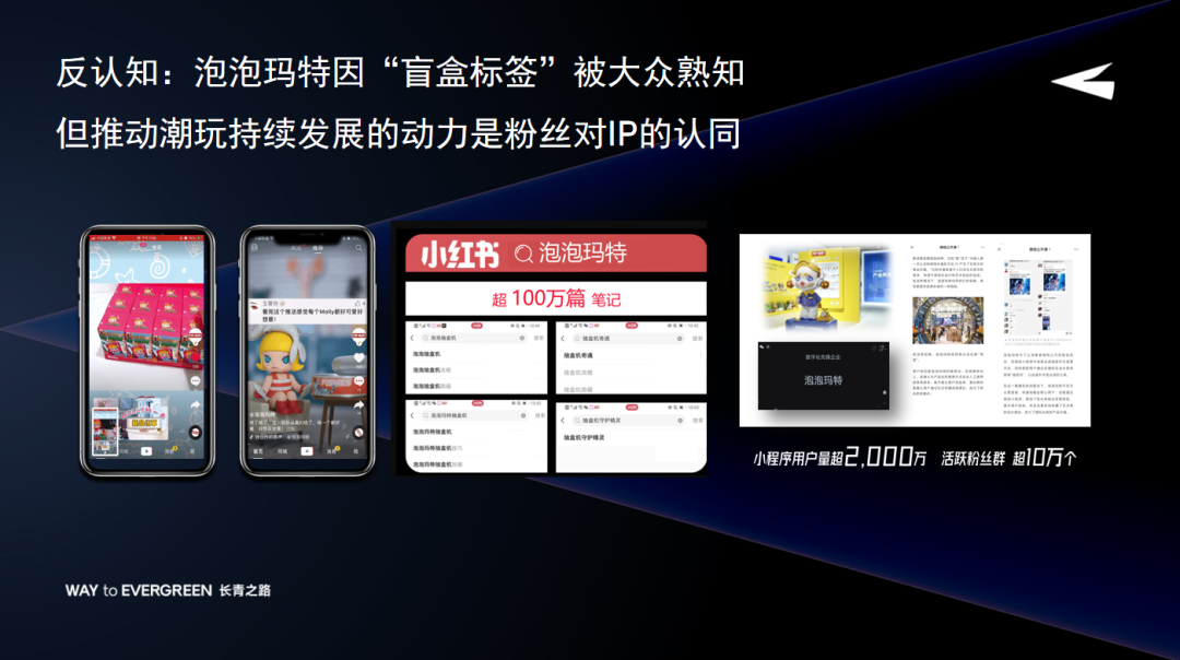 所以,潮玩领域的粉丝有一个非常强的特性,就是乐于分享。泡泡玛特在小红书的笔记数量达到100多万篇,小程序用户数超过2000万,粉丝社群甚至超过了10万个。这充分展现了潮玩爱好者群体的特点和兴趣。