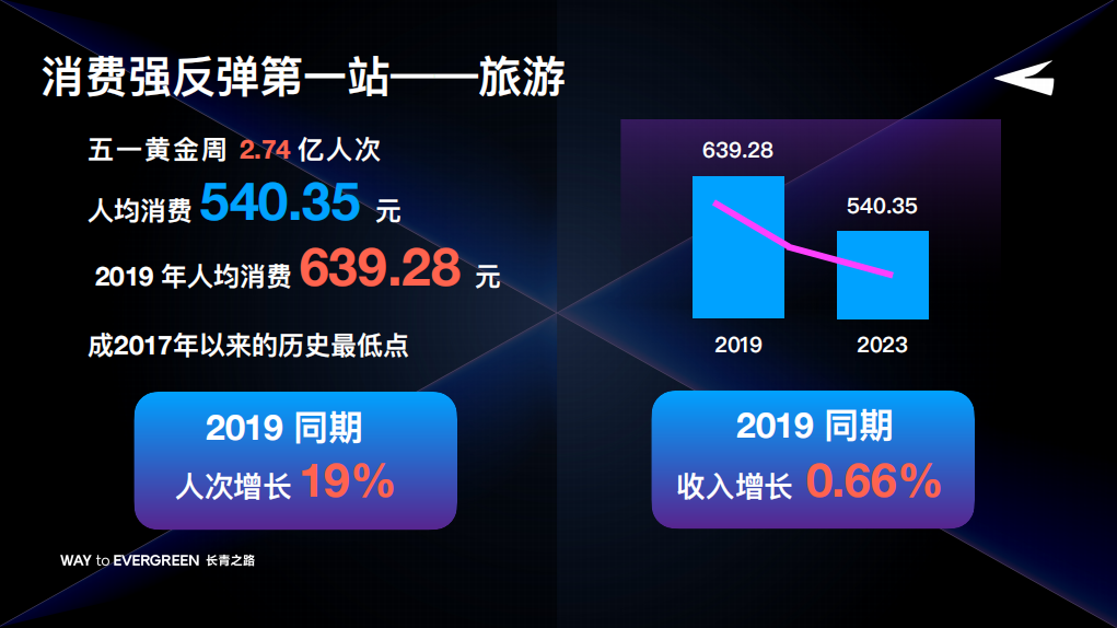 但进一步来看,2023年五一黄金周收入仅比2019年增长了0.66%,人均消费还从639.28降到了540.35元。