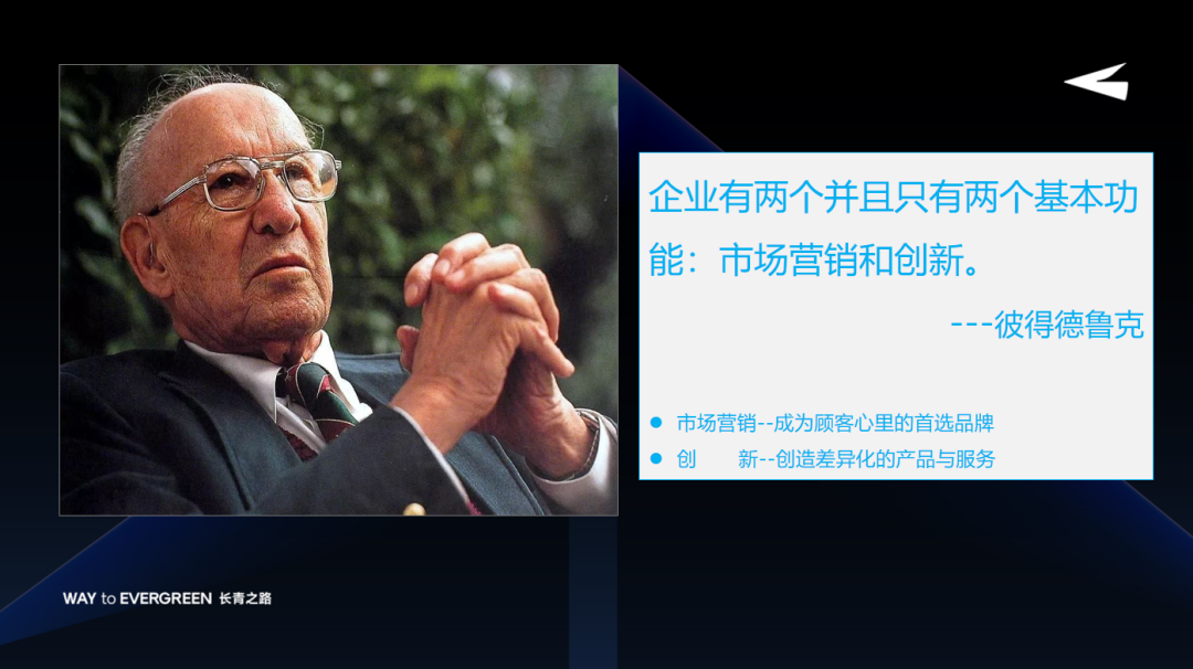 我想分享的第一点是彼得·德鲁克说过的一句话:企业有且只有两个基本功能,那就是市场营销和创新。