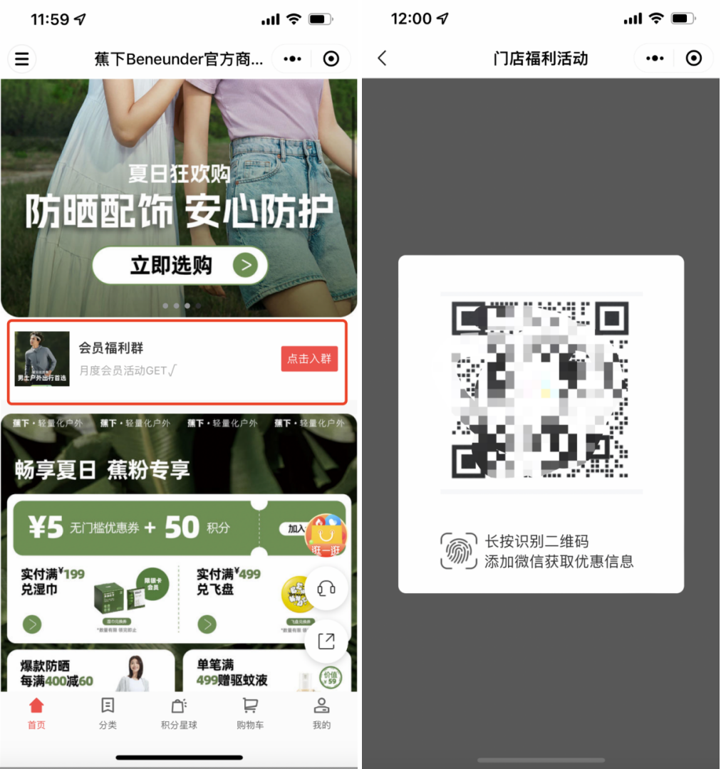 在小程序「蕉下Beneunder官方商城」首页中,有「会员福利群」的引流窗口,点击扫码即可进入社群。