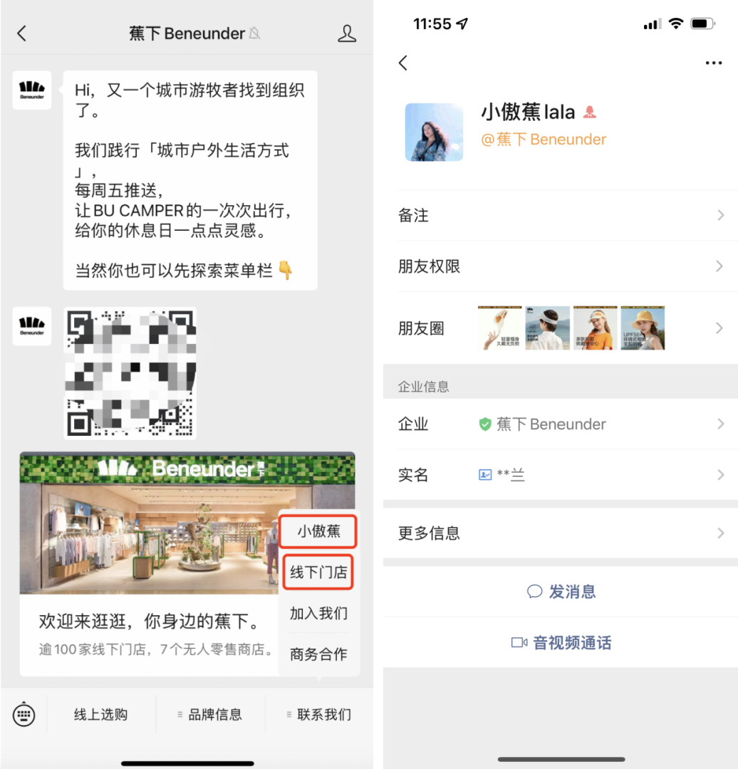 在「蕉下Beneunder」公众号的菜单栏内设置了引流渠道,点击「小傲蕉」可直接扫码添加官方企微客服账号。此外点击「线下门店」可查看所有门店地址,对线下进行引流。