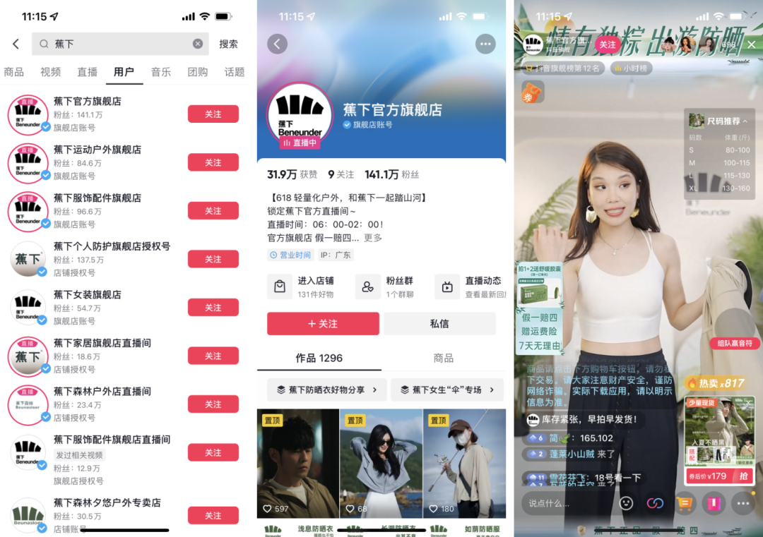 蕉下在抖音建立了账号矩阵,几个主要账号的粉丝总和超过300万。