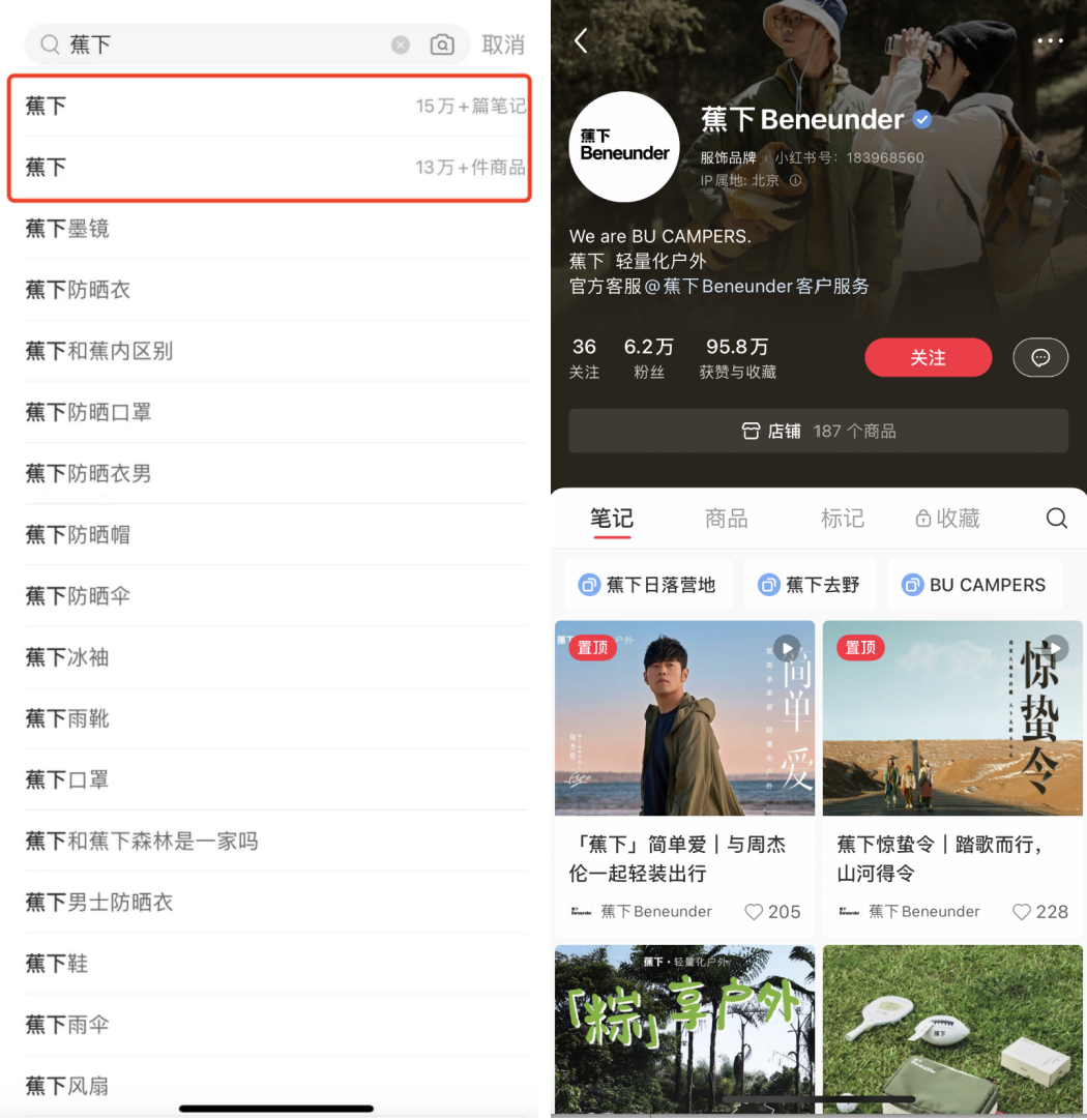 蕉下在小红书中相关的笔记15万+篇,官方账号粉丝达到6.2万,笔记内容以品牌宣传、活动宣传为主。