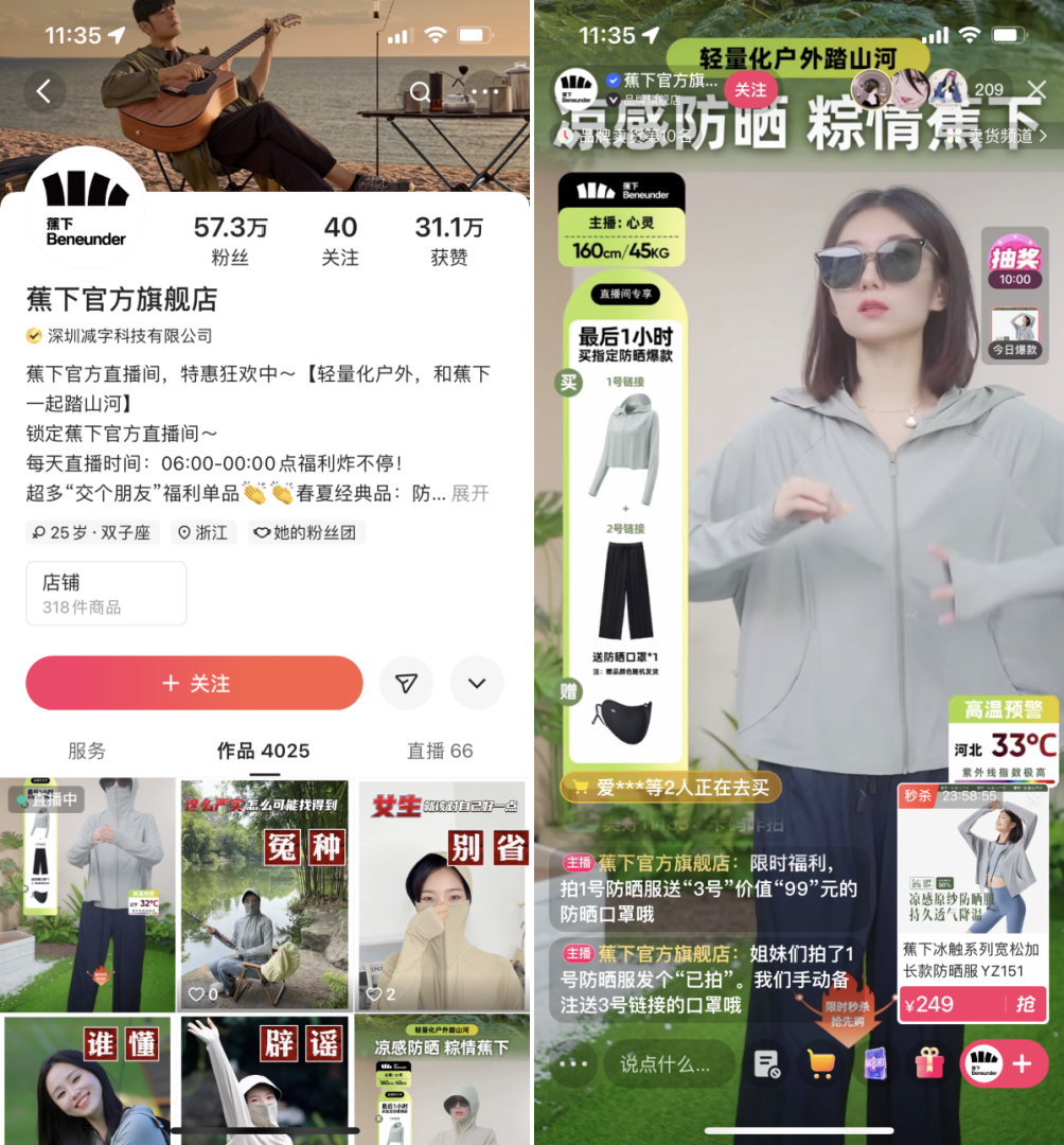 对比抖音来说,蕉下在快手上的运营规模小一些,主账号有57.3万的粉丝。视频内容更多的是直播切片、产品安利等,主账号也是每日开启直播,以卖货为主。