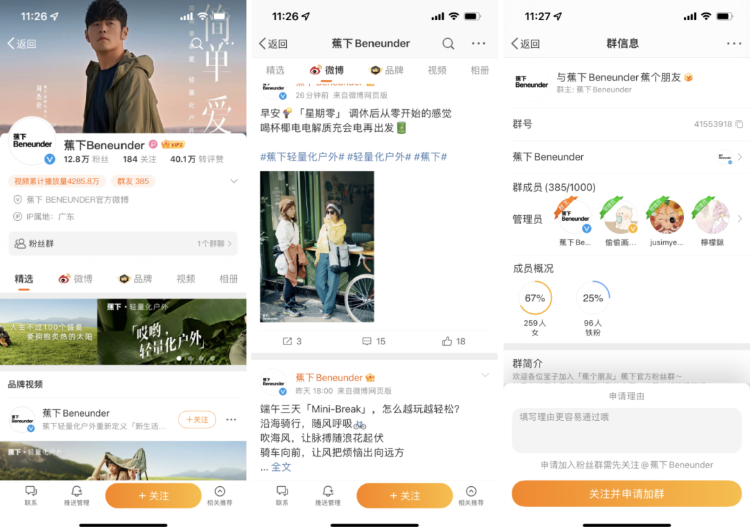 蕉下的微博粉丝有12.8万,主要发布内容为品牌宣传、活动宣传、产品种草等。首页有设置粉丝群引流入口,申请可加入社群。