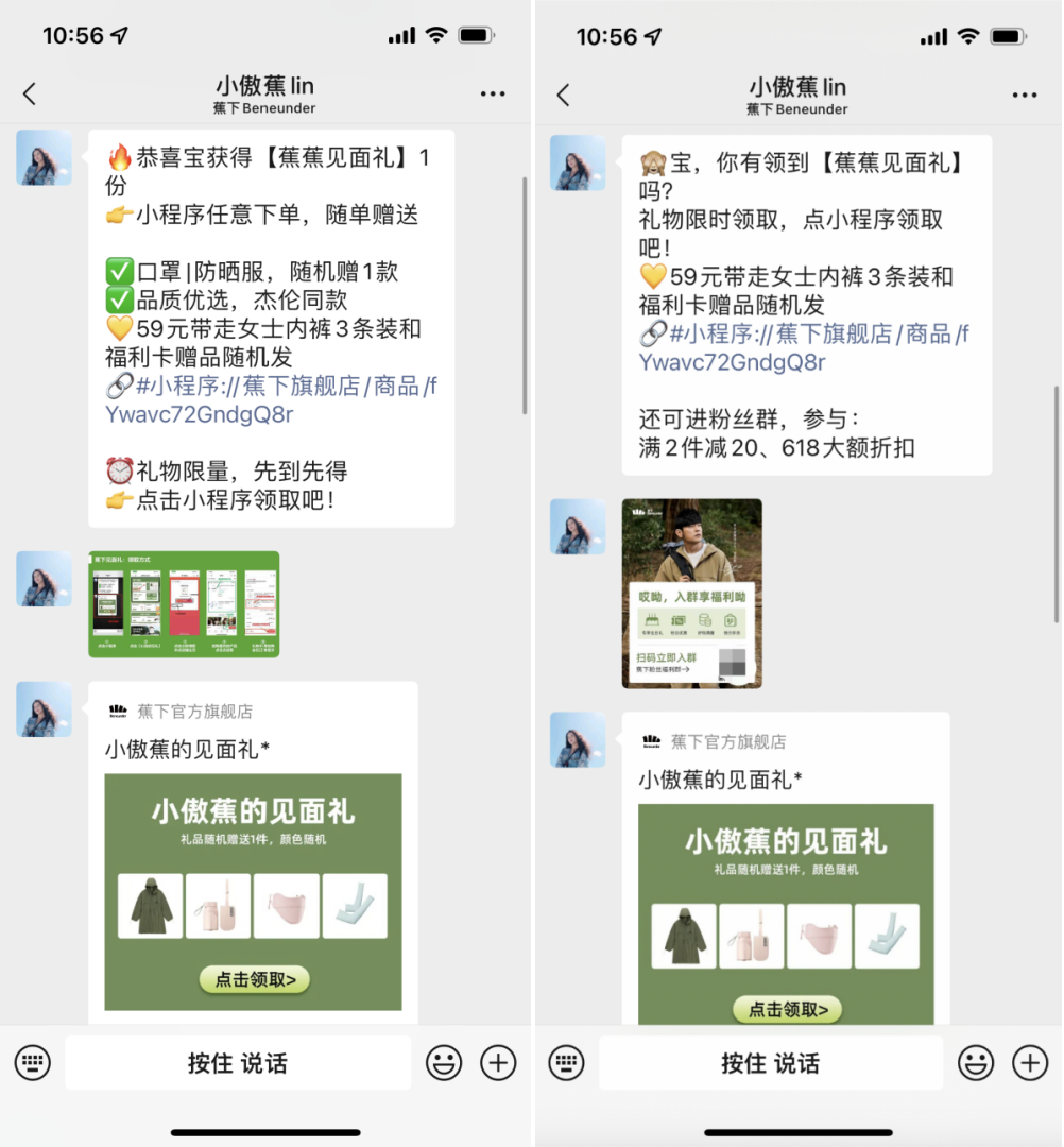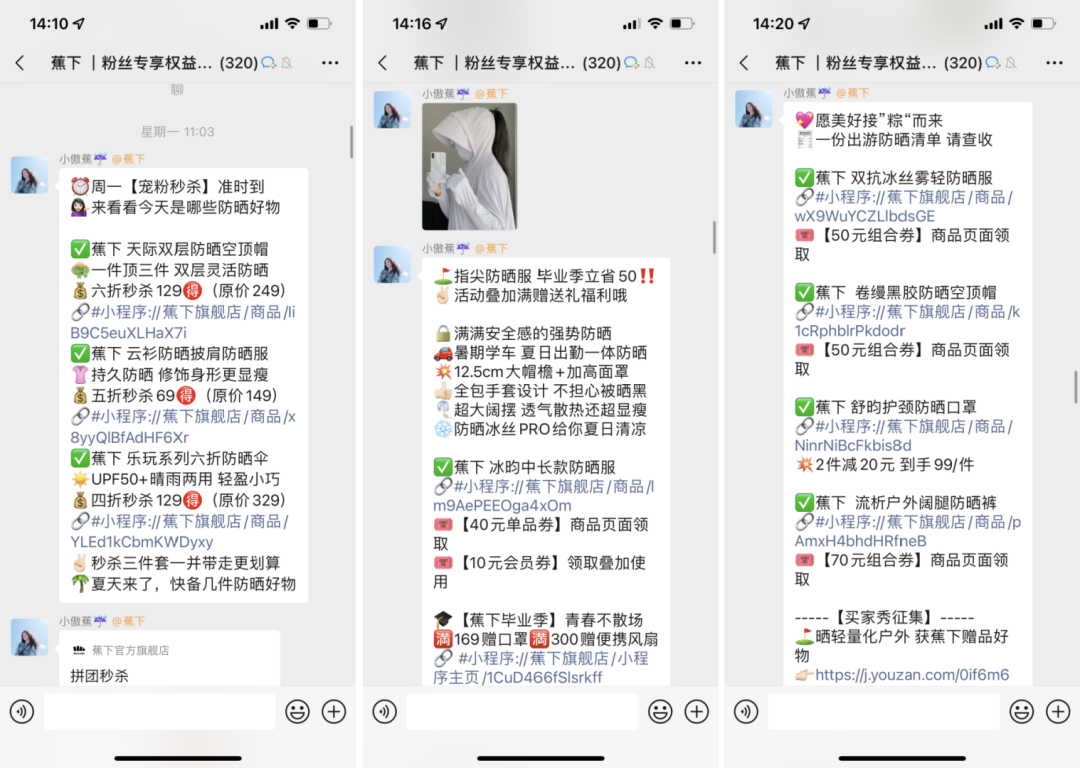 蕉下采用了公众号+小程序+企微+社群的私域运营模式,以及各平台之间相互进行引流。