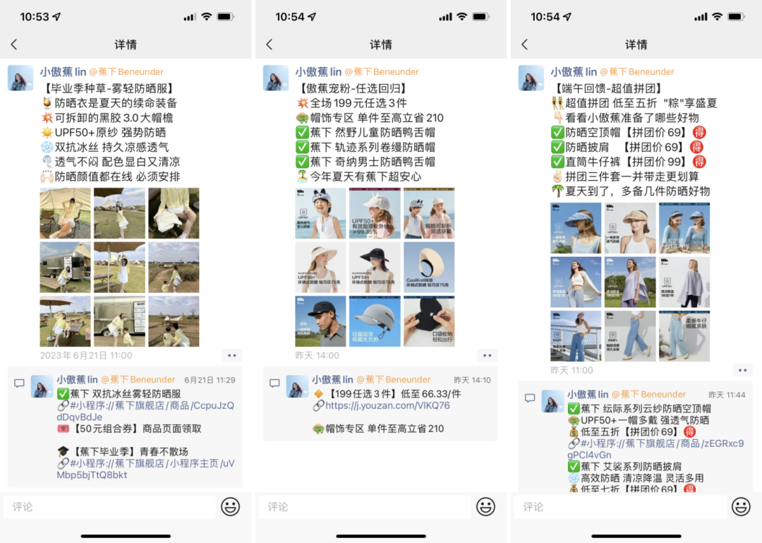 朋友圈内荣:主要以产品种草、拼团秒杀活动为主。每条朋友圈评论区内都会说明优惠券领取方式及小程序商城的链接。