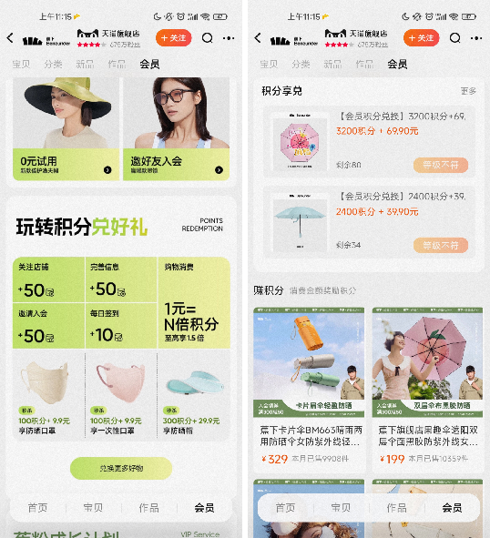蕉下电商平台的会员体系比较完善,主要以成长会员+积分体系为主。下面以天猫平台的会员体系为例。