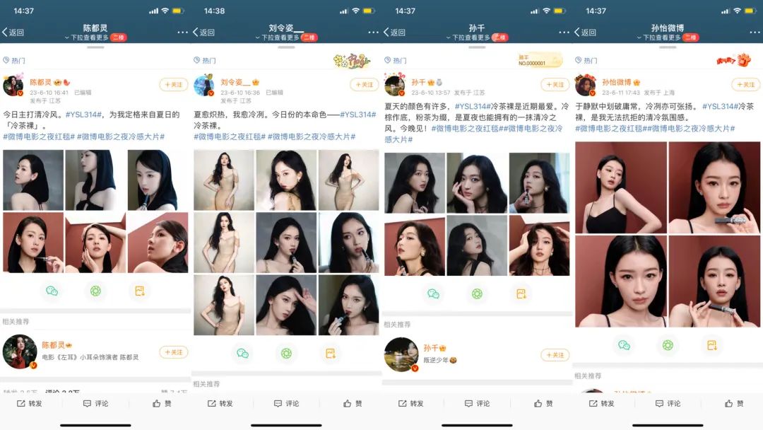 YSL通过热点伴随的方式包揽了所有明星造型话题,实现了品牌高强度的曝光,让用户从关注明星到看到YSL314冷茶稞,更是潜移默化的让用户感知到“YSL是明星美丽背后的好物”。