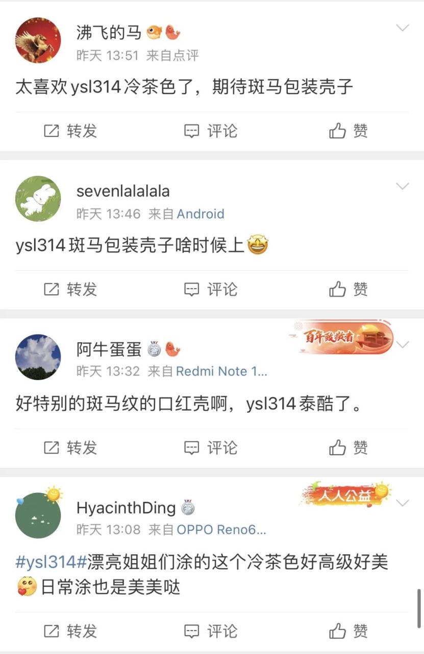 大片发布后,大量粉丝表示红毯还得是YSL314,“漂亮姐姐们涂的这个冷茶色好高级好美,日常涂也是美美哒”、“太喜欢YSL314冷茶色了,期待斑马包装壳子”、“好特别的斑马纹的口红壳呀,YSL314泰裤了”等评论比比皆是。