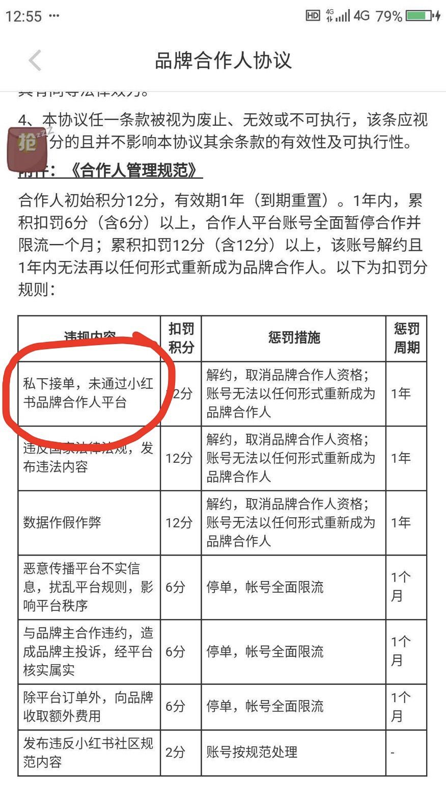 更重要的是,想绕过平台方私下接单也变得不再可行。根据新的《品牌合作人协议》,合作人初始积分为 12 分,一年内累计扣 6 分以上,合作人将被暂停并限流一个月。扣满 12 分,则直接解约,且一年内再无法再次成为品牌合作人。