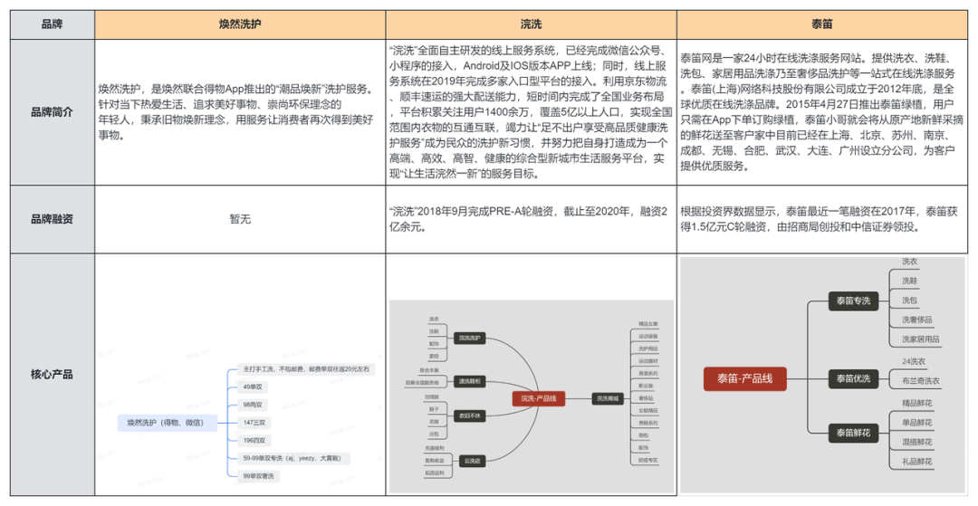1)三个品牌都是属于O2O(洗护)行业,焕然洗护的行业更加细分属于洗鞋,这个赛道比较垂直,以至于无法有太多的行业数据进行支撑,如果说2015年前后是O2O行业的风口,那这些年就是洗鞋行业的风口,作为从业者深有感触。