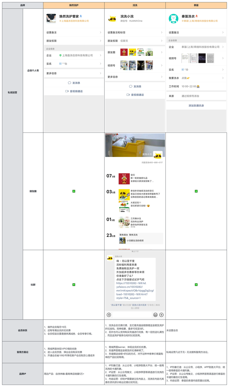 泰笛的用户触点最为全面,自建app进行业务承接;焕然洗护的触点最少,只专注在微信生态跟垂直细分的电商购物平台;浣洗在三个品牌中朋友圈跟社群触点做的较好(都一般,全靠队友衬托。)
